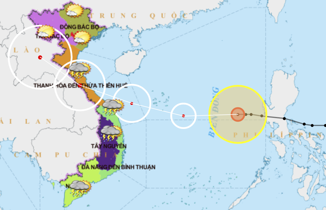 Vùng nguy hiểm do bão trên Biển Đông trong 24 giờ tới (gió mạnh từ cấp 6 trở lên, giật từ cấp 8 trở lên): từ vĩ tuyến 13,0 đến 18,0 độ Vĩ Bắc; từ kinh tuyến 111,5 đến 120,0 độ Kinh Đông. Toàn bộ tàu thuyền hoạt động trong vùng nguy hiểm đều có nguy cơ cao chịu tác động của gió giật mạnh.