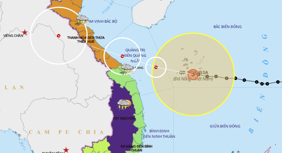 Vùng nguy hiểm do bão trên Biển Đông trong 24 giờ tới (gió mạnh từ cấp 6 trở lên, giật từ cấp 8 trở lên): từ vĩ tuyến 13,5 đến 18,5 độ Vĩ Bắc; phía Tây kinh tuyến 114,5 độ Kinh Đông. Toàn bộ tàu thuyền hoạt động trong vùng nguy hiểm đều có nguy cơ cao chịu tác động của gió giật mạnh.