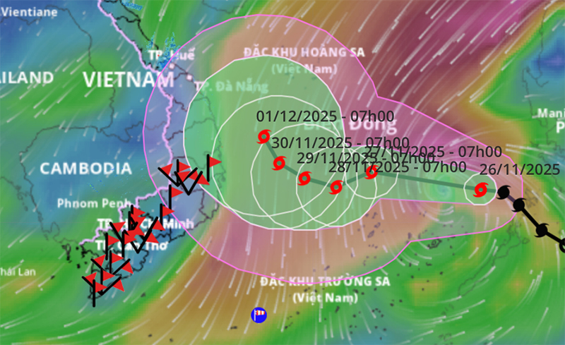 Dự báo đến 7h ngày 27/11, vị trí tâm bão số 15 trên khu vực giữa Biển Đông, cách đảo Song Tử Tây khoảng 170km về phía Bắc, đổi hướng Tây Tây Bắc và di chuyển chậm lại với tốc độ 15-20km/h, khả năng mạnh thêm với cường độ cấp 10, giật cấp 13.
