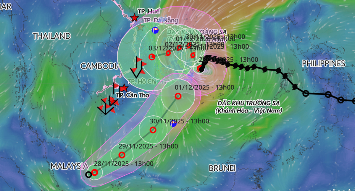 Đến 13h ngày 30/11, áp thấp nhiệt đới trên vùng biển phía Tây Nam khu vực Nam Biển Đông, di chuyển theo hướng Đông Bắc, tốc độ khoảng 15km/h và duy trì cường độ cấp 7, giật cấp 9.