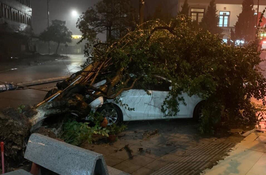 Một cây xanh bật gốc, đổ đè lên xe ô tô ở TP Móng Cái (Quảng Ninh).