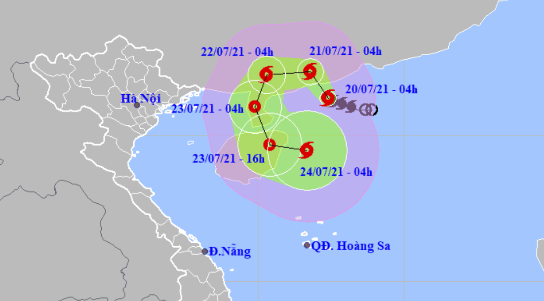 Dự báo trong 24 giờ tới, bão di chuyển theo hướng Tây Bắc, mỗi giờ đi được khoảng 5km. Đến 4h ngày 21/7, tâm bão trên đất liền phía Tây Nam tỉnh Quảng Đông (Trung Quốc). Sức gió mạnh nhất vùng gần tâm bão mạnh cấp 9 (75-90km/giờ), giật cấp 11.