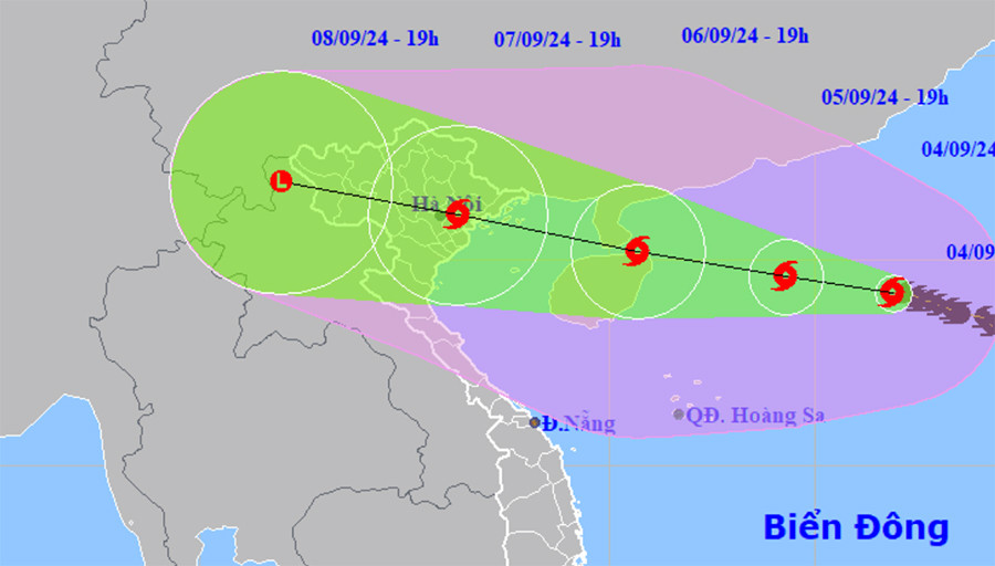Trung tâm Dự báo khí tượng thuỷ văn quốc gia cho biết, lúc 19h ngày 4/9, vị trí tâm bão số 3 (tên quốc tế Yagi) trên vùng biển phía Đông Bắc khu vực Bắc Biển Đông, cách đảo Hải Nam (Trung Quốc) khoảng 650km về phía Đông. Sức gió mạnh nhất vùng gần tâm bão mạnh cấp 13-14 (134-166km/h), giật cấp 17, di chuyển theo hướng Tây Tây Bắc, tốc độ 5-10km/h.