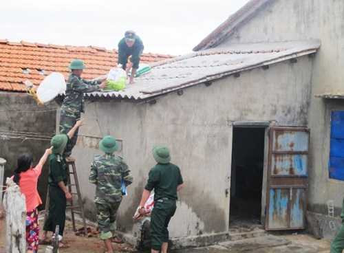 | Bộ đội giúp dân phường Phú Đông, TP Tuy Hòa (Phú Yên) chằng chống nhà cửa chống bão. (Ảnh: Quang Lê) |