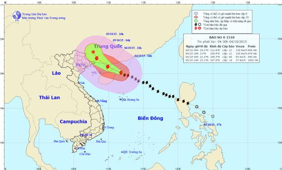 Dự báo trong 24h tiếp theo, cơn bão số 4 tiếp tục di chuyển theo hướng Tây Tây Bắc, đến 16h ngày 5/10, vị trí tâm bão ở vào khỏang 20 độ vỹ Bắc, 109,9 độ kinh Đông; sức gió mạnh nhất ở vùng tâm bão đi khoảng 120km/h.