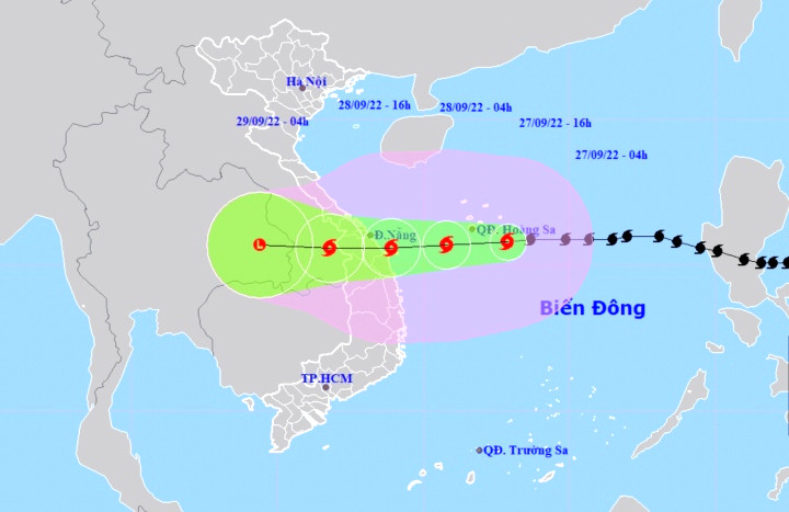 Dự báo trong 12 giờ tới, bão di chuyển chủ yếu theo hướng Tây, mỗi giờ đi được 20-25km và khả năng mạnh thêm. Đến 16h ngày 27/9, vị trí tâm bão cách Đà Nẵng khoảng 300km, Quảng Nam khoảng 250km, Quảng Ngãi khoảng 240km về phía Đông. Sức gió mạnh nhất vùng gần tâm bão mạnh cấp 14-15 (150-183km/giờ), giật cấp 17.