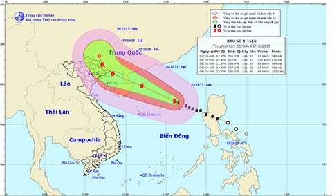 Theo thông tin từ Trung tâm dự báo KTTV Trung ương, bão số 4 mang tên Mujigae có sức gió giật cấp 9-10 đã vượt qua đảo Luzon (Philippines) đi vào Biển Đông theo hướng Tây Tây Bắc.