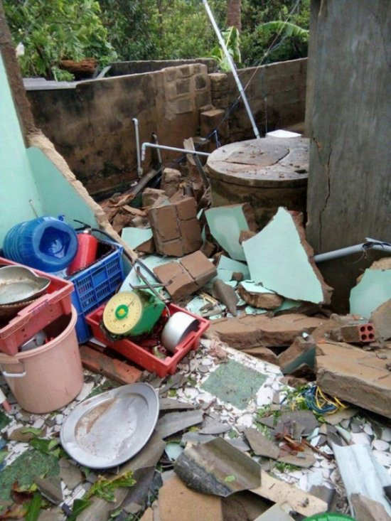 Đại diện UBND xã Ngũ Phụng cho biết, gió lốc cuốn bay mái, làm hư hỏng, sập đổ tường hàng chục ngôi nhà, hoa màu thiệt hại nặng nề.