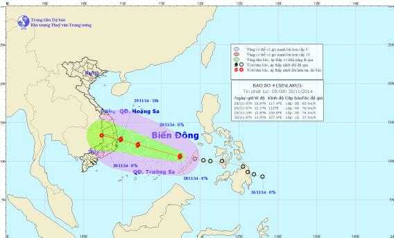 Theo Trung tâm Dự báo Khí tượng thuỷ văn Trung uong, đêm qua (27/11), áp thấp nhiệt đới đã đi vào vùng biển phía Đông Nam Biển Đông và sáng nay (28/11) đã mạnh lên thành bão, cơn bão số 4 và có tên quốc tế là Sinlaku.