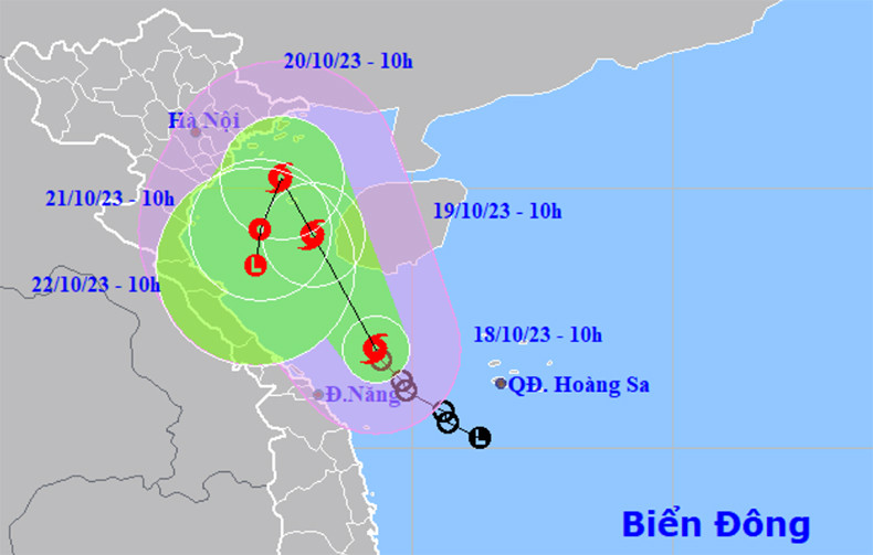 Dự báo đến 10h ngày 20/10, bão số 5 trên khu vực vịnh Bắc Bộ, tiếp tục di chuyển theo hướng Bắc Tây Bắc, tốc độ khoảng 5 km/h. Sức gió mạnh nhất vùng gần tâm bão cấp 8, giật cấp 11. Khu vực chịu ảnh hưởng: vịnh Bắc Bộ, vùng biển từ Quảng Trị đến Thừa Thiên Huế.