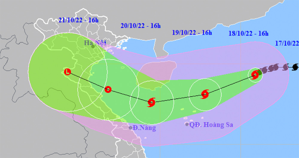 Cụ thể, lúc 16h ngày 17/10, vị trí tâm bão cách quần đảo Hoàng Sa khoảng 500km về phía Đông Bắc. Sức gió mạnh nhất vùng gần tâm bão mạnh cấp 12 (118-133km/giờ), giật cấp 14, di chuyển theo hướng Tây Tây Nam với tốc độ khoảng 15km/h.