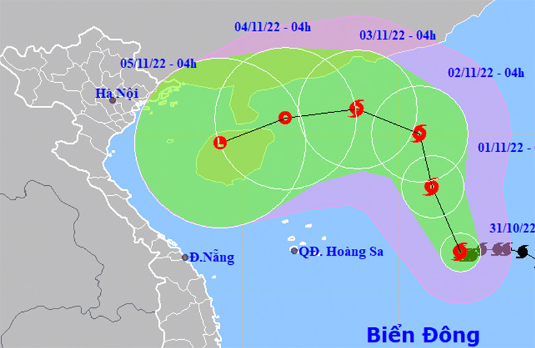 Theo Trung tâm Dự báo Khí tượng Thuỷ văn Quốc gia, lúc 4h ngày 31/10, vị trí tâm bão số 7 cách quần đảo Hoàng Sa khoảng 590km về phía Đông. Sức gió mạnh nhất vùng gần tâm bão mạnh cấp 10 (89-102km/giờ), giật cấp 12, xu hướng mạnh dần lên trong 24 giờ tới.