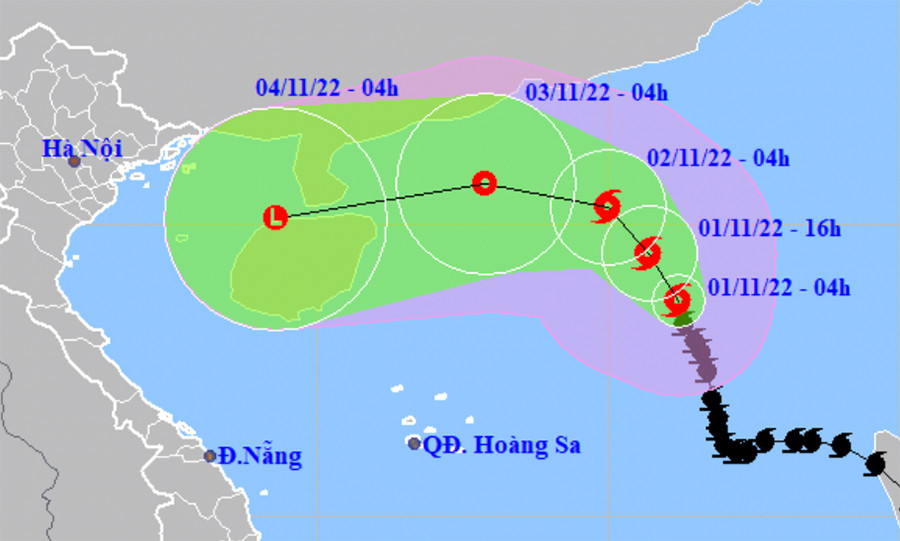 Đến 4h ngày 2/11, bão cách quần đảo Hoàng Sa khoảng 550 km về phía Đông Bắc, cường độ mạnh cấp 10-11, giật cấp 13.