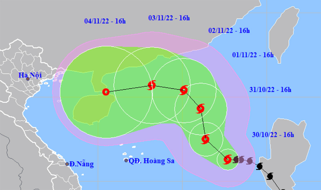 Cụ thể, lúc 16h ngày 30/10, vị trí tâm bão trên vùng biển phía Đông khu vực Bắc Biển Đông. Sức gió mạnh nhất vùng gần tâm bão mạnh cấp 9-10 (75-102km/h), giật cấp 12, xu hướng mạnh dần trong 24 đến 48 giờ tới.