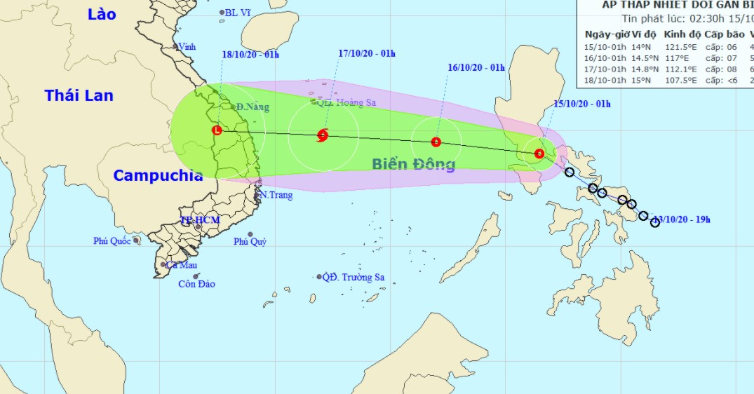 Theo Trung tâm Dự báo KTTV quốc gia, lúc 1h ngày 15/10, tâm áp thấp nhiệt đới ở khoảng 14,0 độ Vĩ Bắc; 121,5 độ Kinh Đông, ngay trên khu vực miền Trung Philippines. Sức gió mạnh nhất vùng gần tâm áp thấp nhiệt đới mạnh cấp 6 (40-50km/giờ), giật cấp 8.