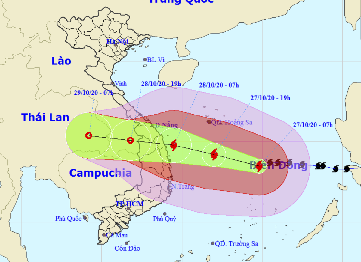 Dự báo trong 24 giờ tới, bão di chuyển theo hướng Tây Tây Bắc, mỗi giờ đi được 20-25km. Đến 7h ngày 28/10, tâm bão ở ngay trên vùng biển từ Đà Nẵng đến Phú Yên. Sức gió mạnh nhất vùng gần tâm bão mạnh cấp 13 (135-150km/giờ), giật cấp 16.