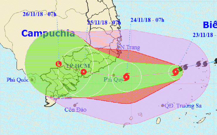 Theo Trung tâm Dự báo KIhí tượng Thủy văn Quốc gia, hồi 13h ngày 24/11, vị trí tâm bão ở vào khoảng 9,6 độ Vĩ Bắc; 108,7 độ Kinh Đông, cách Phan Thiết khoảng 180km, cách Vũng Tàu khoảng 200km, cách Bến Tre 230km.