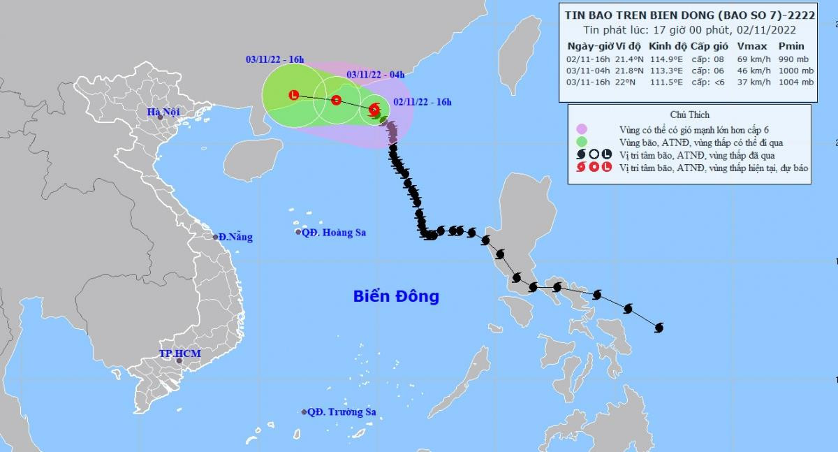 Theo Trung tâm dự báo khí tượng thủy văn quốc gia, hồi 16h ngày 2/11, vị trí tâm bão số 7 ở vào khoảng 21,4 độ Vĩ Bắc; 114,9 độ Kinh Đông, cách Hong Kong (Trung Quốc) khoảng 130km về phía Nam Đông Nam.