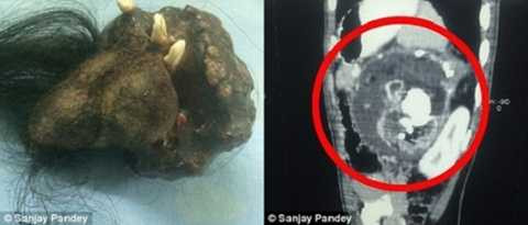 Chàng trai Ấn Độ 18 tuổi có bào thai ký sinh từ khi sinh ra và sau khi phẫu thuật bào thai có đường kính 20 cm, với mái tóc dài gần 2 m.