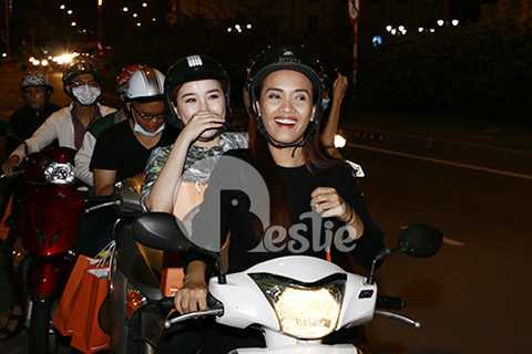 | Dù buổi phát quà diễn ra vào lúc đêm khuya nhưng hai nữ ca sĩ vẫn rất vui vẻ và háo hức. Họ cùng nhau tạo dáng xì tin trước giờ xuất phát. |