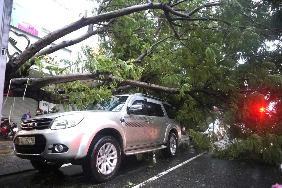 Đường phố ở Đà Nẵng trời tối sẫm, thưa vắng người dân qua lại. Tại tuyến đường Nguyễn Văn Linh (quận Hải Châu), cây xanh ngã đè lên ô tô của người dân.