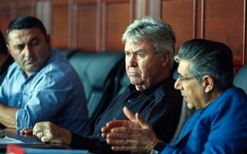 Guus Hiddink (giữa) cùng thành viên ban huấn luyện trong buổi gặp lãnh đạo bóng đá Trung Quốc mới đây. (Ảnh: Sina)