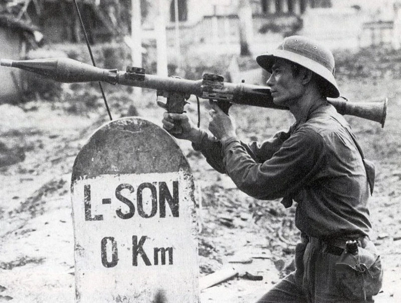 Hình ảnh người chiến sĩ cầm súng B41 hướng về phía quân xâm lược, bên cạnh là cột mốc số 0 Lạng Sơn, rạng sáng 17/2/1979 mang tính biểu tượng về cuộc chiến đấu bảo vệ biên giới phía Bắc năm 1979. (Ảnh: Tư liệu/TTXVN phát)