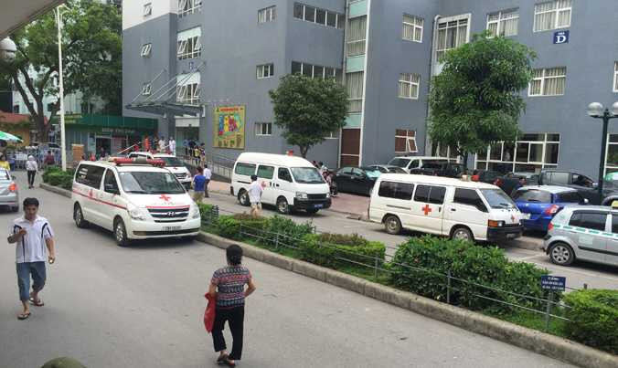 Xe cứu thương của các đơn vị khác nhau trong khuôn viên BV Việt Đức. Ảnh: T. Hoàng.