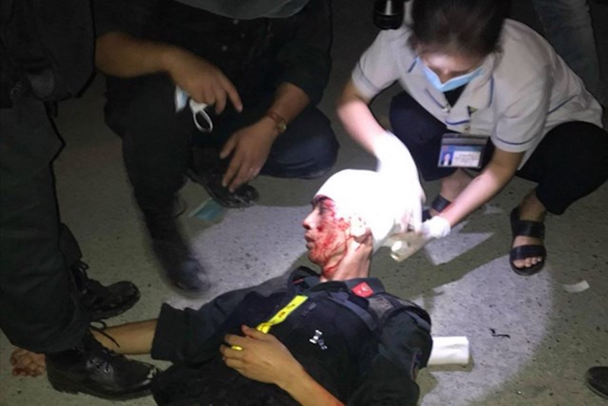 Một chiến sĩ công an bị hàng hung và đang được nhân viên y tế sơ cứu vết thương. (Ảnh: H.T).