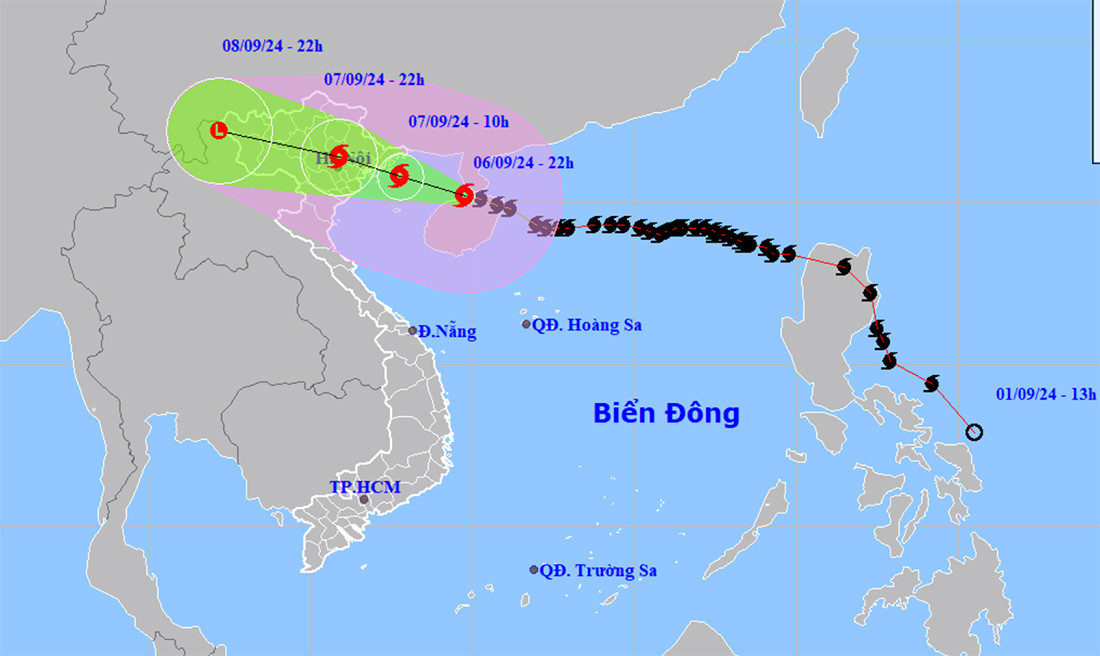 Lúc 22h ngày 6/9, vị trí tâm bão số 3 ở vào khoảng 20,2 độ Vĩ Bắc; 109,8 độ Kinh Đông, trên vùng biển phía Đông vịnh Bắc Bộ, cách Quảng Ninh khoảng 310km về phía Đông Đông Nam. Sức gió mạnh nhất vùng gần tâm bão mạnh cấp 14 (150-166km/h), giật cấp 17, di chuyển theo hướng Tây Tây Bắc, tốc độ 15-20km/h.