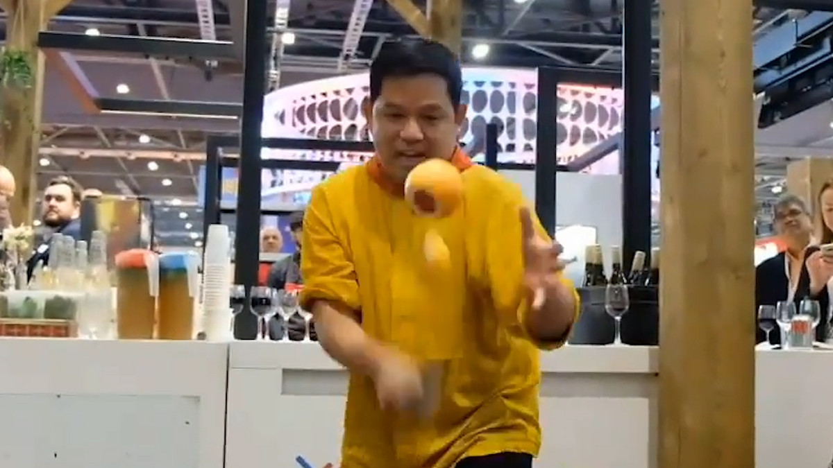 Bartender tung tuyệt chiêu dùng dao cắt vỏ cam trên không trung ở Anh
