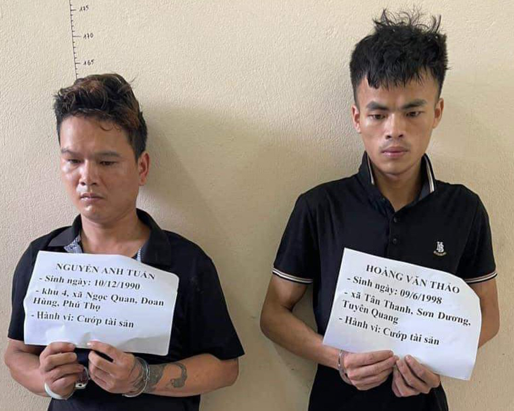 Ngày 30/7, theo thông tin từ Công an huyện Đoan Hùng (Phú Thọ), đơn vị vừa bắt giữ 2 đối tượng cướp tài sản của người dân là Hoàng Văn Thảo (SN1998), HKTT xã Tân Thanh, huyện Sơn Dương, tỉnh Tuyên Quang và Nguyễn Anh Tuấn (SN 1990), cư trú tại khu 4, xã Ngọc Quan, huyện Đoan Hùng, tỉnh Phú Thọ.