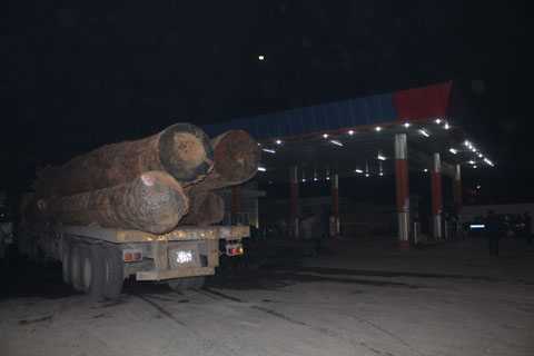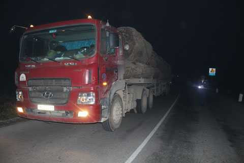 | Xe chở gỗ quá tải bị lực lượng liên ngành kiểm tra tải trọng phương tiện vây bắt. |