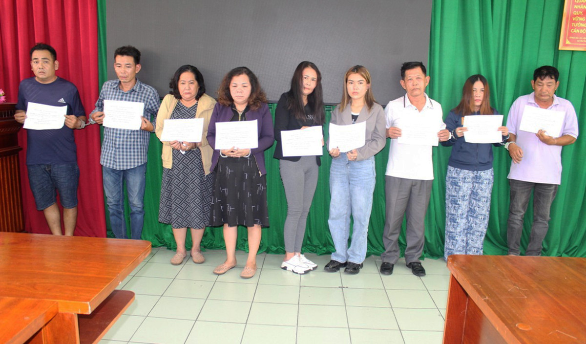 Chân, Phú, Hạnh, Nguyệt, Tâm, Ni, Trí, Hiền, Đức (từ trái qua phải) tại cơ quan điều tra. (Ảnh Công an cung cấp)