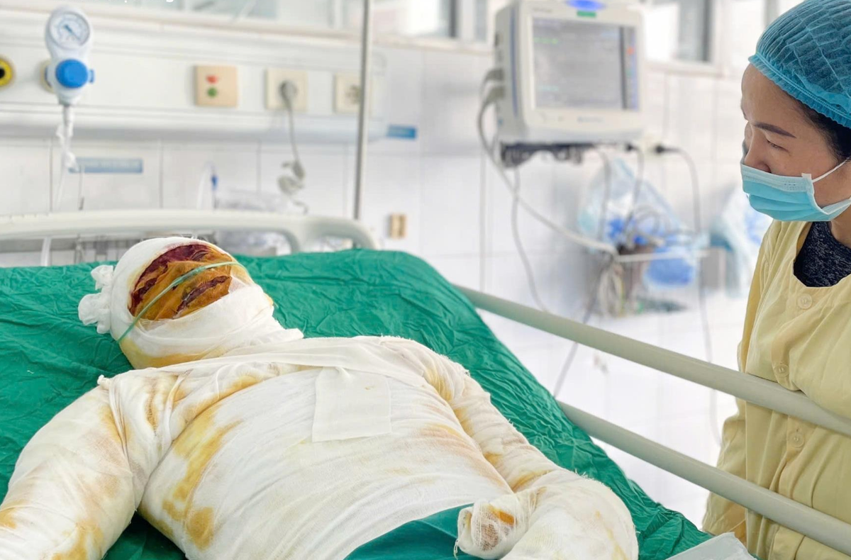 Theo bác sĩ Hoàng Văn Vụ, Khoa Hồi sức tích cực, Bệnh viện Bỏng Quốc gia, bệnh nhân Chung bỏng 60% diện tích cơ thể, có vùng nguy cơ bỏng sâu độ 4 – mức độ nghiêm trọng có thể phải cắt bỏ mô hoại tử và ghép da.