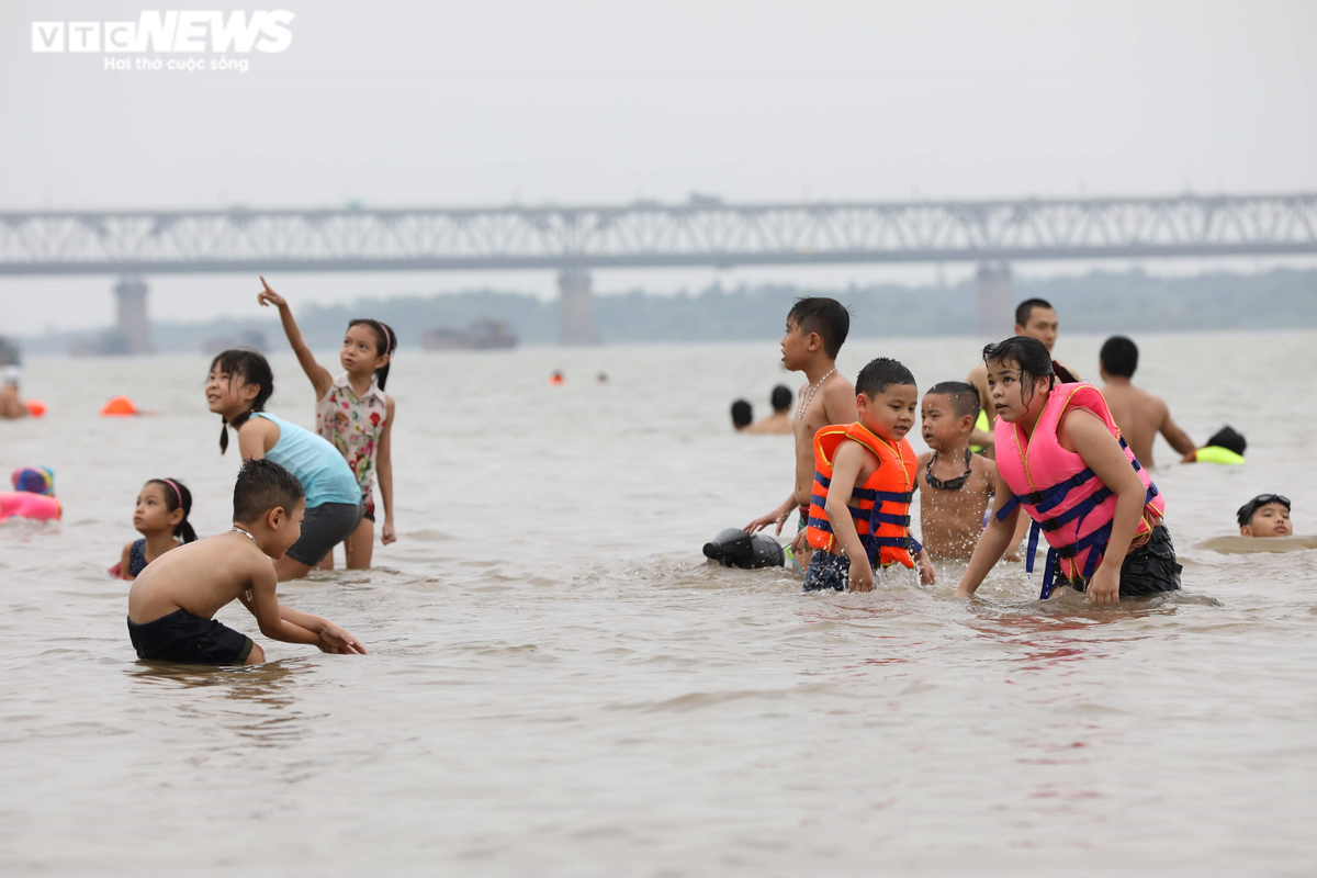 Những ngày đầu tháng 5, nhiệt độ tăng cao, nhiều người dân quanh khu vực phường Phú Thượng, quận Tây Hồ (Hà Nội) đến bãi cát bồi ven sông Hồng để tắm mát. Đây là bãi tắm tự phát, chính quyền địa phương không cho phép bơi.