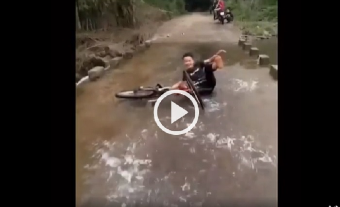 Học theo cậu bé, anh chàng đi xe đạp ngã ướt sạch áo quần.