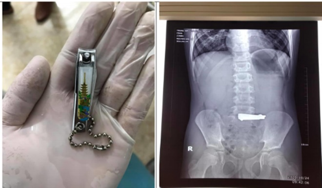 Qua thăm khám và nội soi dạ dày, các bác sĩ phát hiện dị vật là một chiếc bấm móng tay có kích thước 60x16mm, nằm tại vị trí phình vị lẫn thức ăn, gây tổn thương xước niêm mạc dạ dày. Bệnh nhi được nội soi, gắp dị vật thành công.