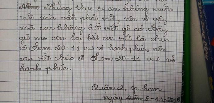 Chị H. cũng cho biết thêm, do bé Minh Khang không thích việc luyện viết nên chữ không được đẹp. Cũng vì thế mà chị thường xuyên tìm cớ để “ép” bé luyện viết. Đối với bức thư này, chị phải nói dối bé rằng “Nếu bạn học sinh nào mà không viết thư thăm hỏi cô giáo nhân ngày 20/11, thì sẽ là học sinh hư”. Vì vậy mà bé mới chịu cầm bút để viết.