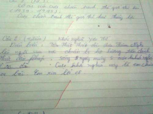 Có thể thấy, cách ra đề cũng như nội dung trong bài kiểm tra này không hề đánh đố và là những kiến thức cơ bản trong sách giáo khoa, nhưng học sinh lại làm bài rất “bá đạo”. Với câu 1, em này chỉ trả lời vỏn vẹn bằng một câu: “Cuộc chiến tranh thế giới thứ hai thắng lợi”.
