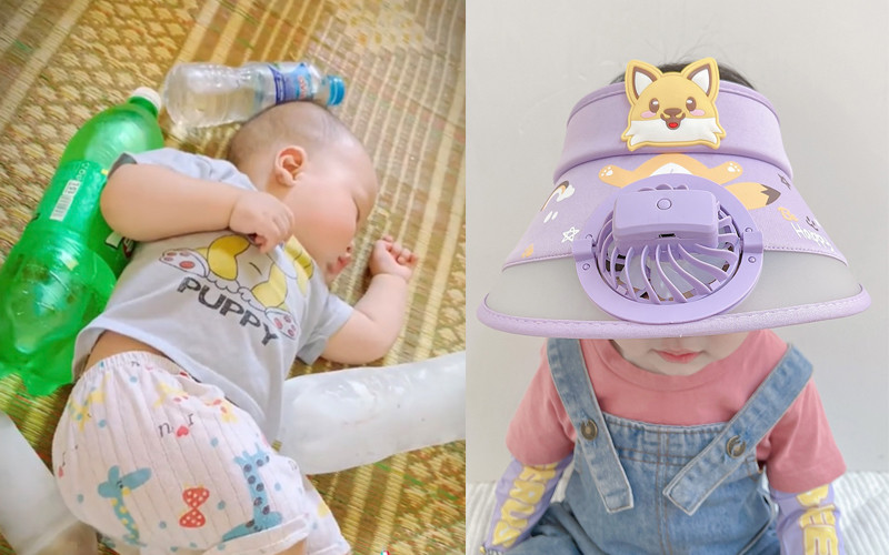 Em bé được giải nhiệt theo kiểu nhà có gì dùng nấy. (Ảnh: Nguyễn Ngọc Yến)