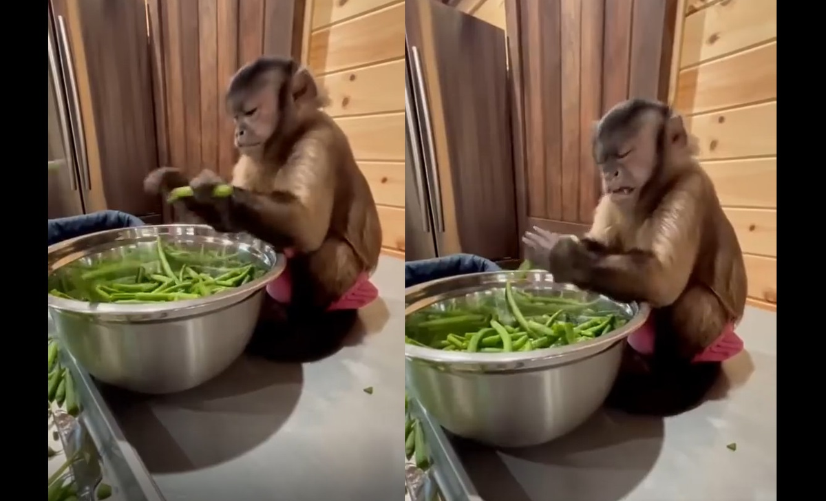Có làm thì mới có ăn, cảnh chú khỉ ngồi cặm cụi nhặt rau một cách thuần thục cùng chủ khiến người xem thích thú.