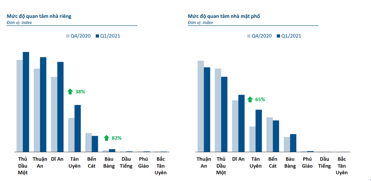 Đáng chú ý, thị trường chứng kiến sự tăng trưởng về mức độ tìm kiếm ở loại hình nhà riêng (38%) và nhà phố (65%) ở Tân Uyên. Điều này cho thấy kỳ vọng của người mua, nhà đầu tư vào Tân Uyên nhằm “đón đầu” thị trường khi mà biên độ tăng giá còn cao, hệ thống cơ sở hạ tầng đang được quy hoạch và tiếp tục đầu tư.
