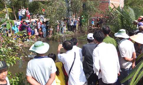 Anh Điệp cho biết sáng 11/2, anh thấy con kênh trước nhà tự nhiên có tiếng động mạnh, đám lục bình trên kênh đảo liên tục, nên ra xem. Khi ra mé kênh, anh thấy một con cá mình dẹp nhiều màu sắc, dài gần 2m.