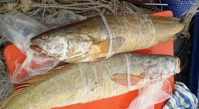 Chủ cặp cá sủ vàng cho biết tàu ra khơi hơn một tuần, đánh bắt hải sản cách đất liền khoảng 8 hải lý. Tối 13/9, các thuyền viên kéo lưới lên tàu phát hiện hai con cá sủ vàng còn sống nên mọi người đưa vào hầm ướp đá ngay để bảo quản, chở về đất liền tìm nơi bán.
