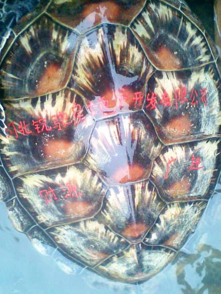 Hai dòng chứ Hán màu đỏ được khắc trên mai rùaChú rùa nặng hơn 20kg, mai màu trắng hồng, bụng màu vàng. Trên mai chú rùa được khắc hai dòng chữ Hán với khoảng hơn 15 chữ, một dòng ngắn, một dòng dài màu đỏ.