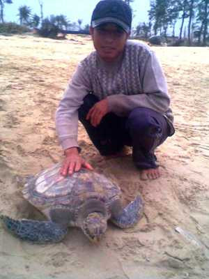 Ngư dân Hồ Văn Năm đã gỡ rùa ra khỏi tấm lưới, đưa lên thuyền rồi nhanh chóng trở vào bờ rồi báo với chính quyền địa phương.