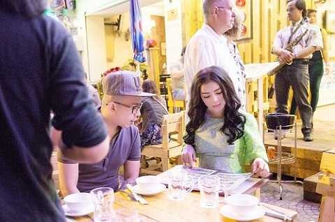 Lý Nhã Kỳ cùng ê kíp làm việc của mình 'dạt' vào một quán ăn vỉa hè ở Sài Gòn.