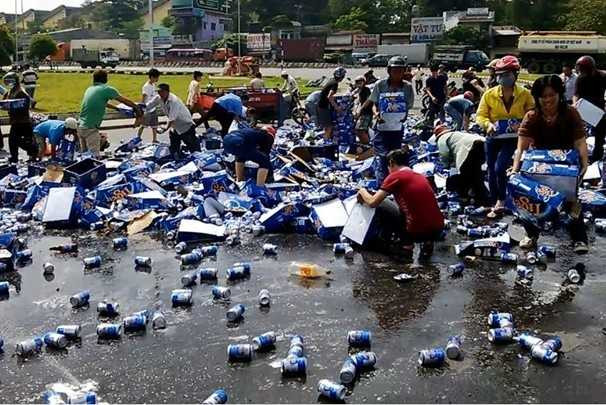 Lúc này, nhiều người dân và người đi đường đã lao vào lấy bia, bất chấp sự van xin của tài xế Hậu.