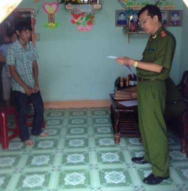| Đại diện cơ quan cảnh sát điều tra đọc lệnh khám xét và bắt tạm giam Đinh Xuân Hiệp (ảnh do PC46 Đồng Nai cung cấp) |